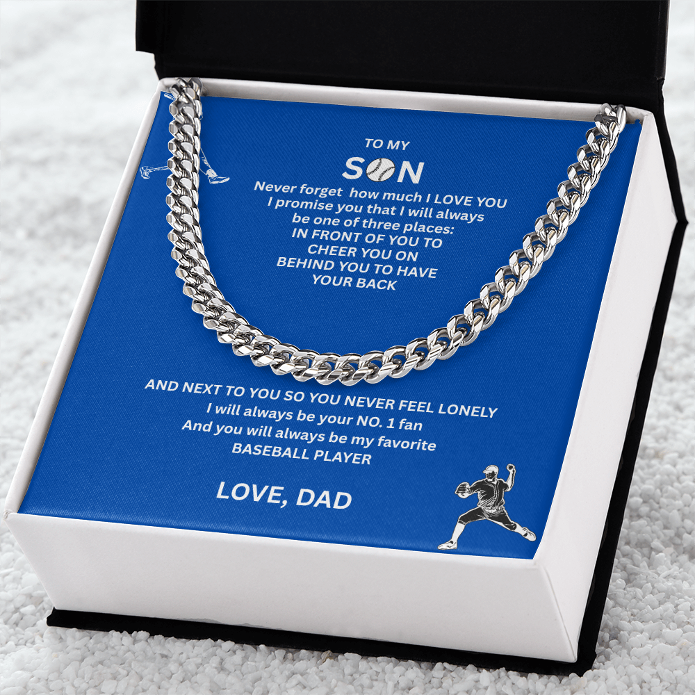 Message Reads: "To My Son, Never forget how much I love you, I promise you that I will always be in one of three places: In front of you to cheer you on, behind you to have your back and next to you so you never feel lonely. I will always be your NO.1 fan. And you will always be my favorite Baseball Player. Love, Dad."